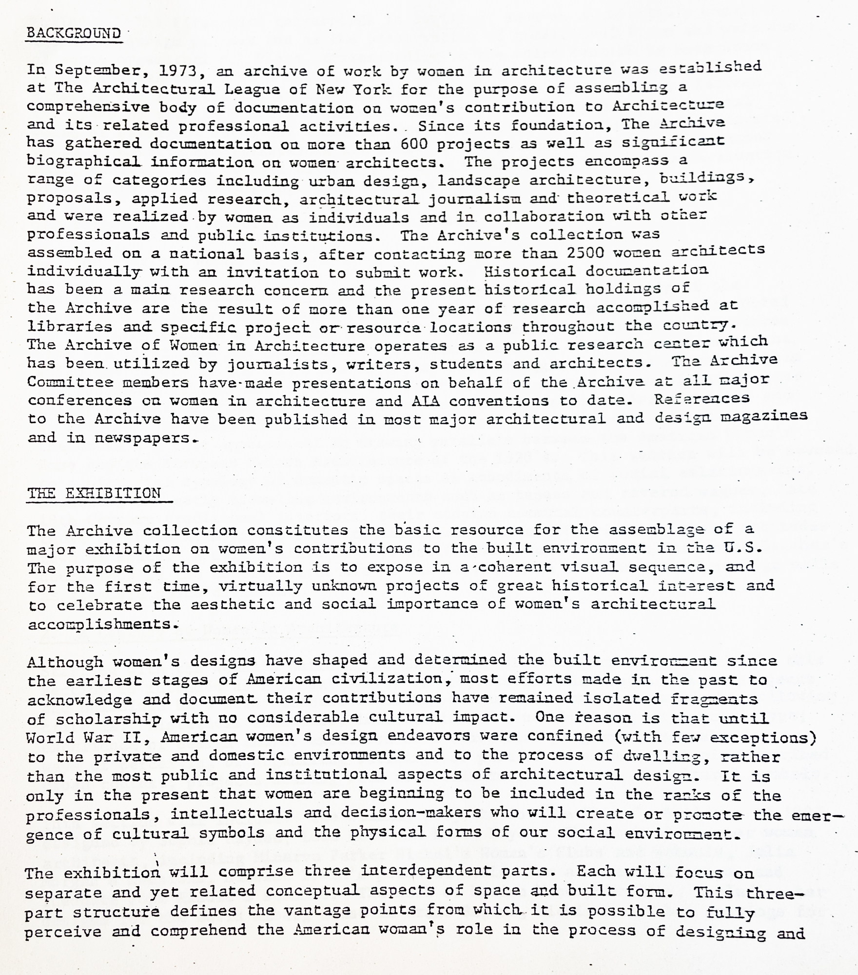 This document, found in the League’s archives, outlines the exhibition’s initial goals and curatorial approach and refers to the project by its original name of Dwelling, Place and Architecture: An Exhibition of Spaces, Projects and Buildings Designed by Women. Although this initial document identifies three main sections for the exhibition—The American Woman’s Home, A Century of Women in Architecture, and Changing Spaces—the final exhibition was restructured into three overarching themes: practitioners and critics, reformers of the domestic sphere, and the Woman’s Building. This document details the curatorial framework, the preliminary selection of works, and the strategic organization of the exhibition. It offers crucial insight into a project that was the result of years of largely voluntary labor, driven by a collective effort among women in architecture to gain recognition and assert their rightful place in the profession’s history.