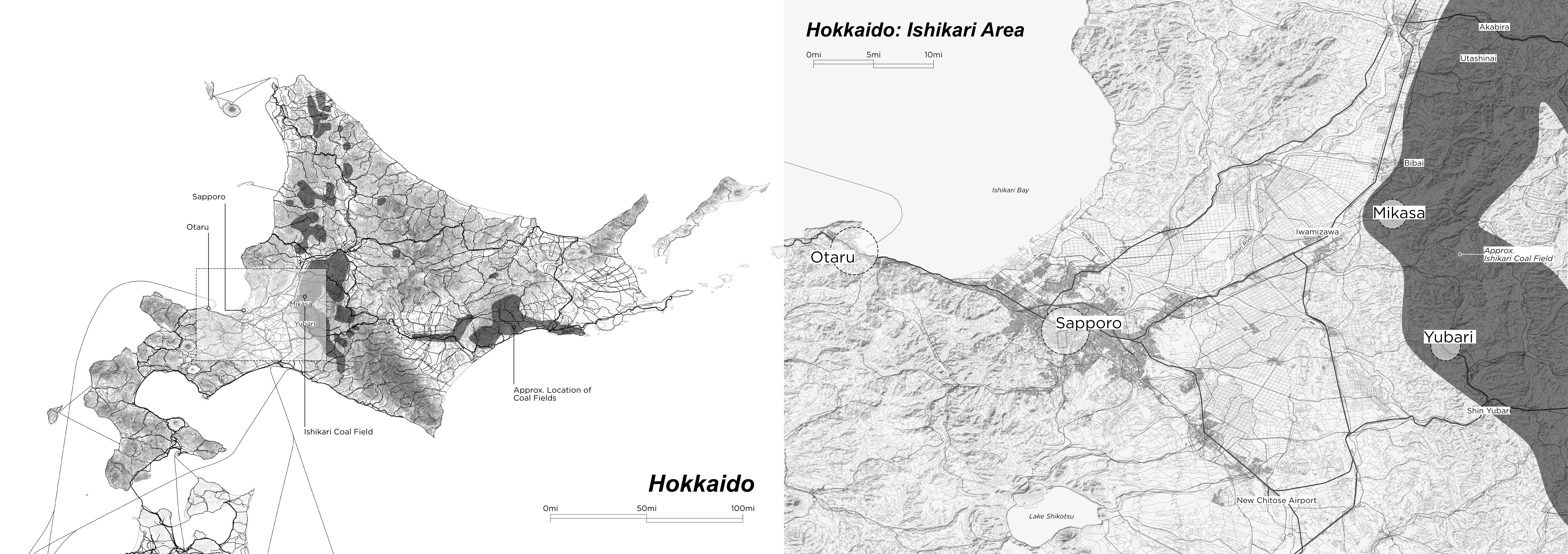 The Ishikari coal field in Hokkaido presents another landscape shaped by extraction, but on a scale far larger and far harsher than the islands of the Seto Inland Sea. The coal field stretches across the western portion of Hokkaido, in the mountains alongside the Ishikari River basin. The entire region embodies a different type of industrial ambition, one marked by the forces of rapid industrialization of the Meiji era that must also grapple with the contentious history of colonization of the island itself, which both enabled and justified Japanese development in the region.