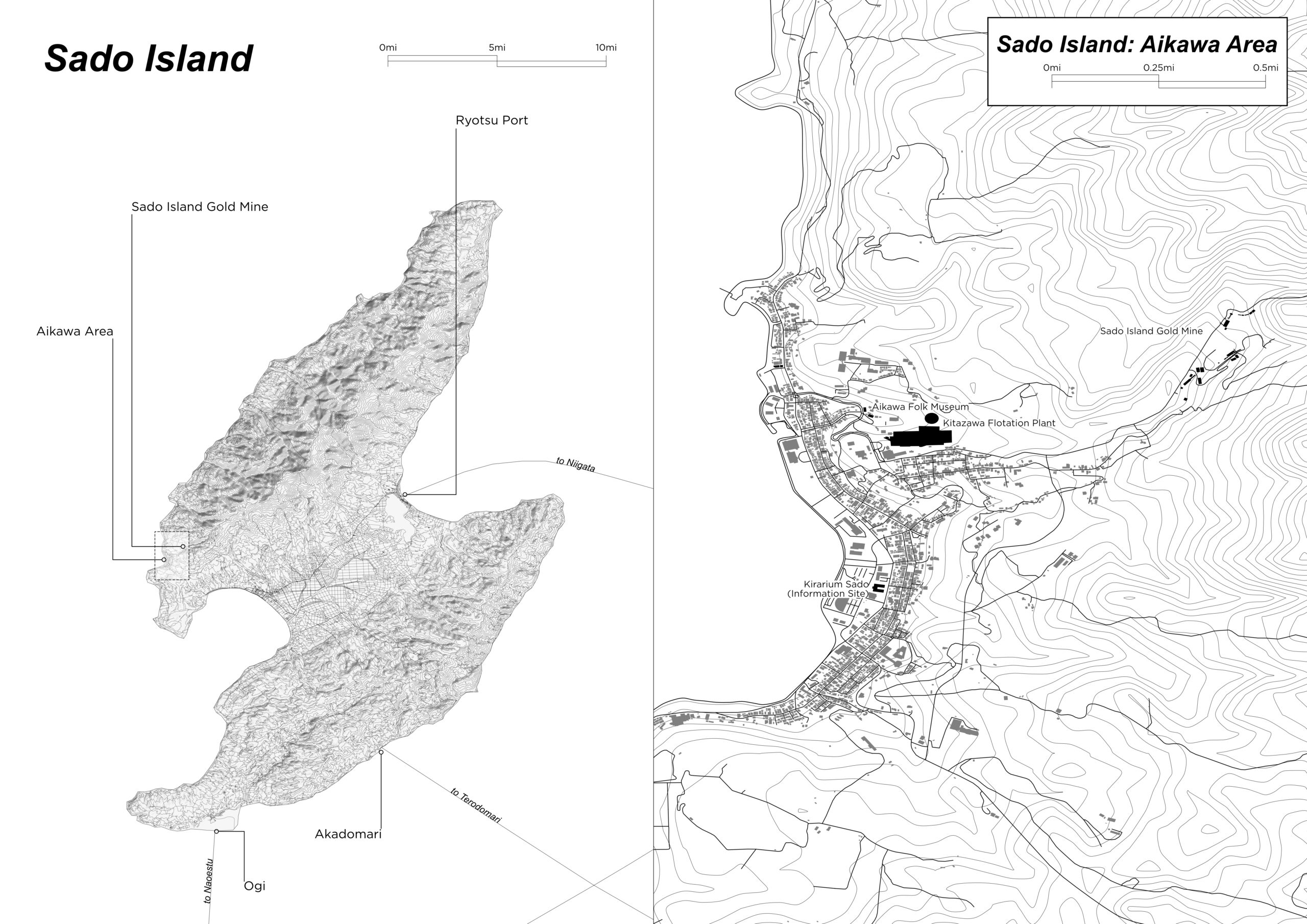 Map of Sado Island [Left] and close-up of the Aikawa Area [Right]. Image credit: Catalina Cabral- Framiñan