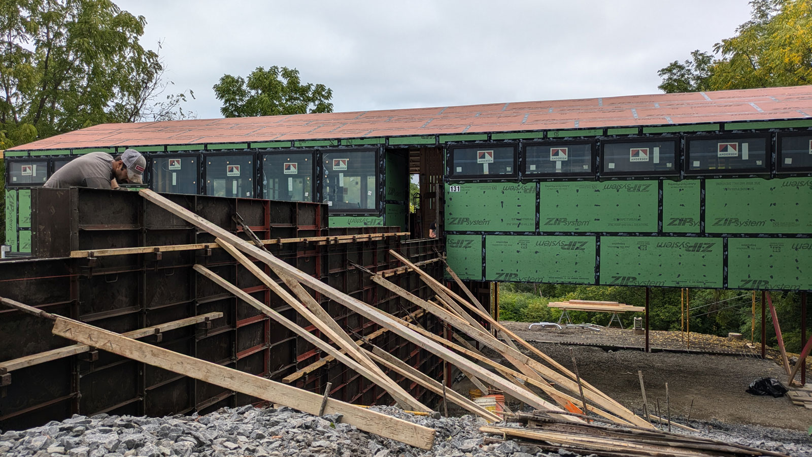 The renovated structure's exterior is framed and enclosed with ZIP System wall and roof sheathing. In the foreground, formwork is being constructed for a large, poured concrete retaining wall, essential for the sloped site. David Costanza Studio | Polycarb House, Ithaca, NY, 2025. Image credit: David Costanza
