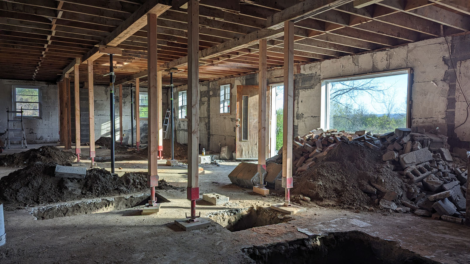 Significant structural work is underway on the lower level, where the slab has been excavated for new concrete footings. Adjustable steel and wood posts temporarily support the floor joists above during the pouring of the new footings. David Costanza Studio | Polycarb House, Ithaca, NY, 2025. Image credit: David Costanza