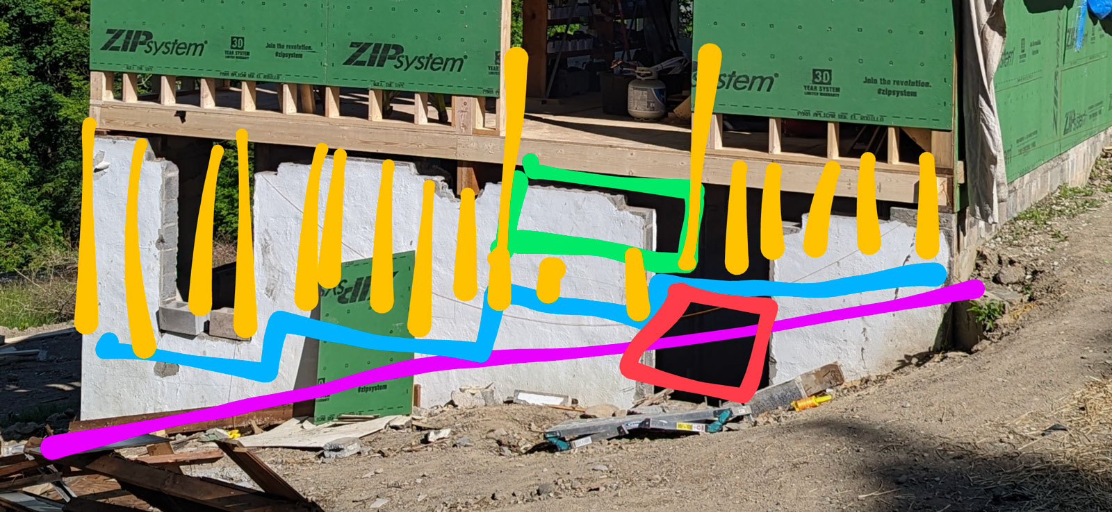 This annotated photo illustrates the process of transforming the existing concrete block foundation into a timber structure. The onsite sketch emphasizes the flexibility required for renovations, as designs are adapted to fit existing and newly discovered conditions during the work. David Costanza Studio | Polycarb House, Ithaca, NY, 2025. Image credit: David Costanza