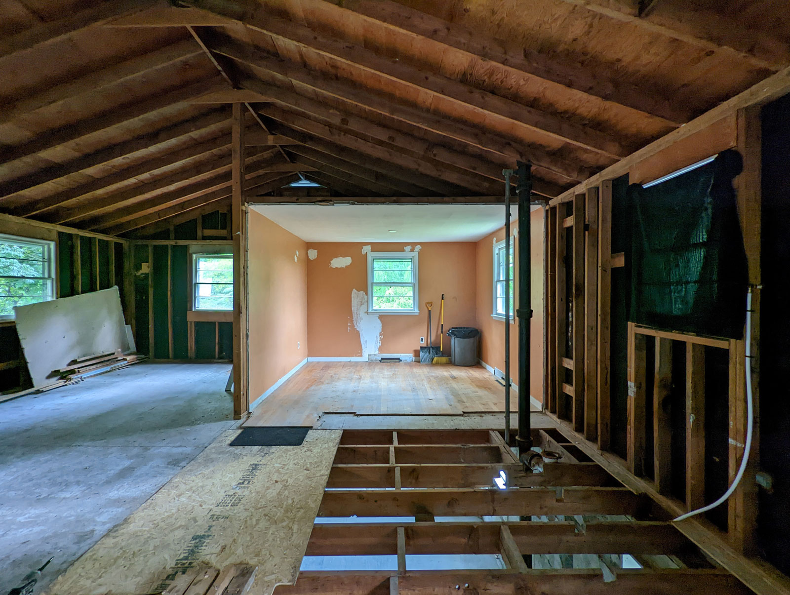 An early stage of the renovation, with the interior completely gutted to expose the original roof and wall framing. The last bedroom is the final space to be demoed and acts almost as a stage set in the construction process. David Costanza Studio | Polycarb House, Ithaca, NY, 2025. Image credit: David Costanza