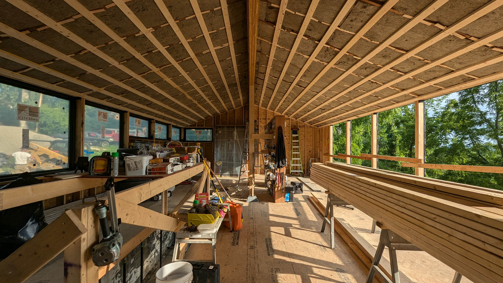 The interior of the new addition is taking shape. Insulation has been installed between the exposed rafters of the vaulted ceiling, and large windows have been added, creating a bright, spacious room. Strapping is placed perpendicular to the joists at 16 inches on center to allow for a thinner ceiling finish and a more regular fastening pattern, as the 1950s rafters vary significantly from the usual 24 inches on center spacing. David Costanza Studio | Polycarb House, Ithaca, NY, 2025. Image credit: David Costanza