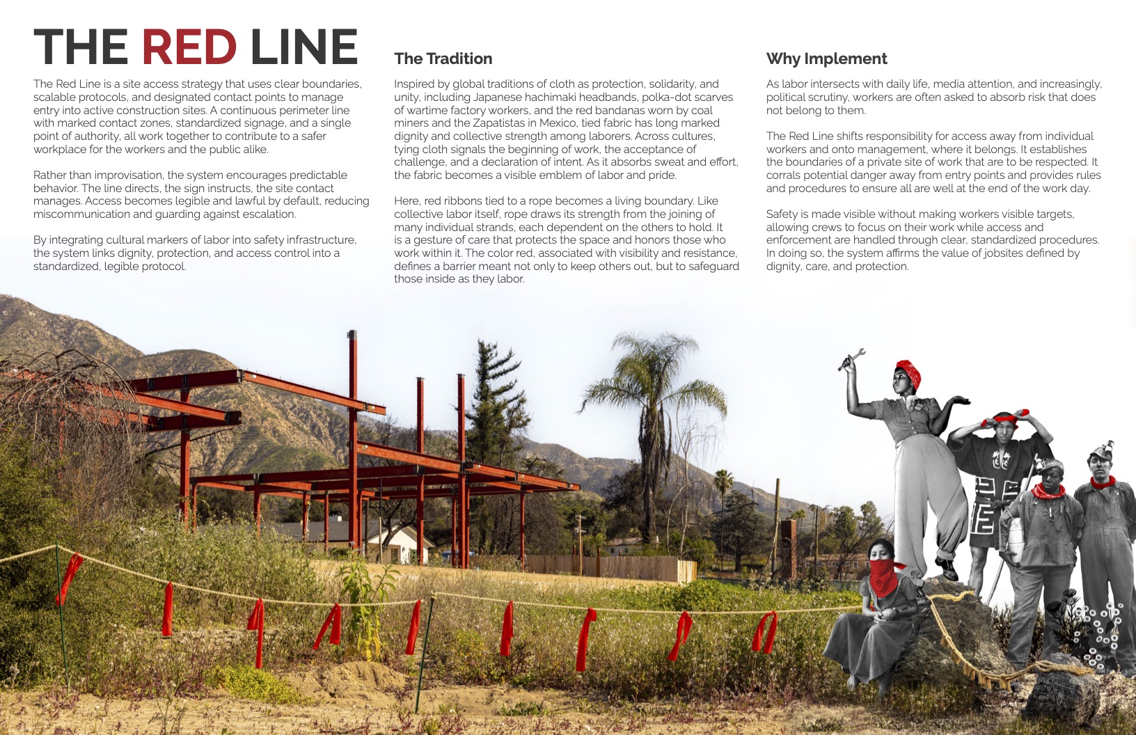 The Red Line, the proposal by winners Eric Arneson and Nahal Sohbati of Topophyla and Gabriel Castro-Andrade, is a site access strategy that uses clear boundaries, scalable protocols, and specific points of contact to manage entry into active jobsites. Inspired by global traditions of cloth as a signifier of protection, solidarity, and unity, the system specifies commonly available materials to establish a continuous perimeter line marked with red fabric, designated contact zones, standardized signage, and a single point of authority.