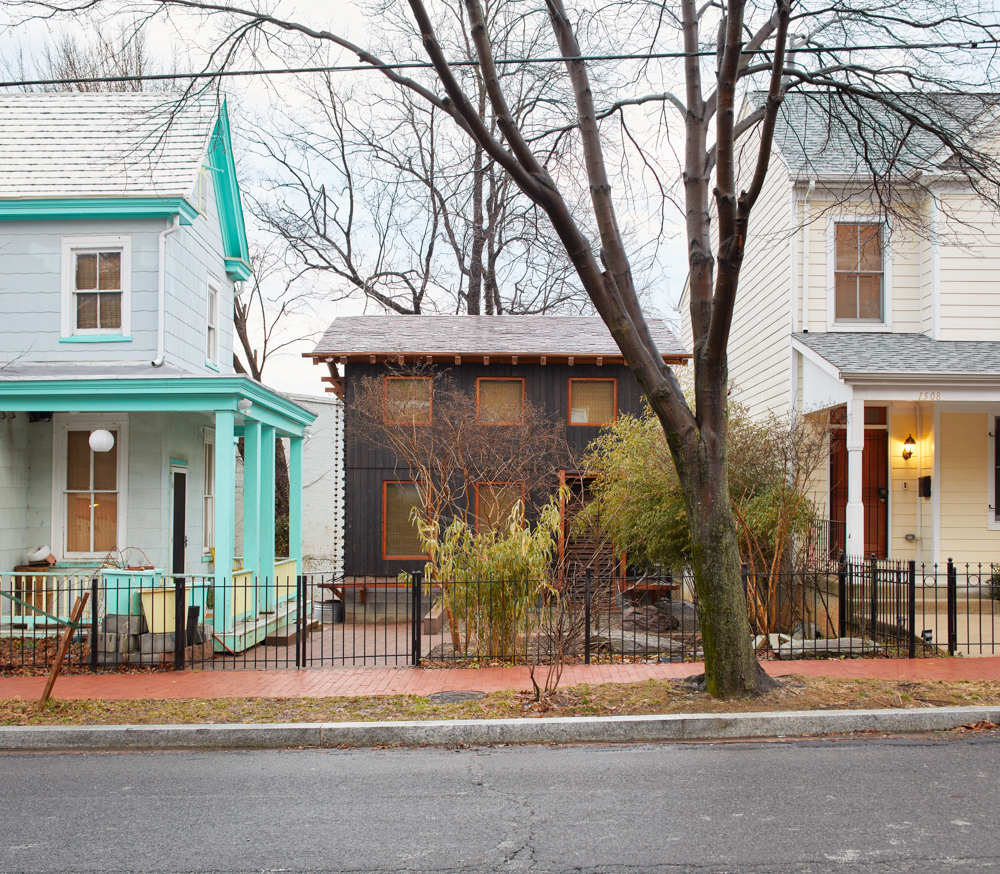 Adelaide Alley, an alley dwelling constructed in response to Washington, DC’s updated zoning code and building regulations, which occupies a formerly unnamed lot and incorporates natural building materials, including tulip poplar bark covering the exterior wall and black locust eaves