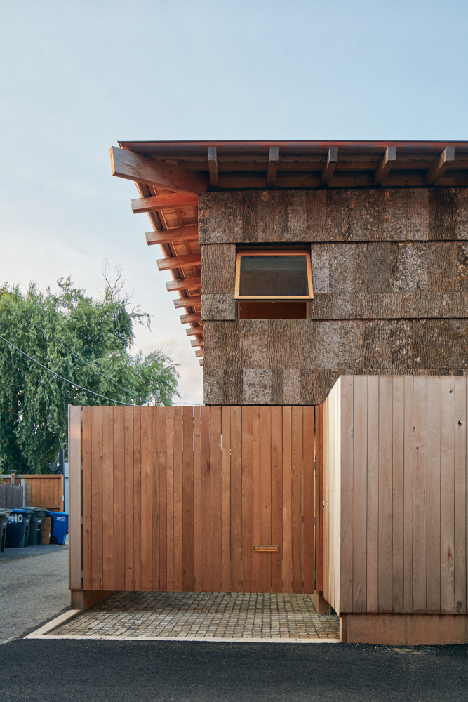 Overbeck Alley, a single-family house that combines healthy construction materials, including a cork-clad facade reinforced by black locust wood slats and bamboo structural walls with cellulose and hemp insulation, with elements like a fenced-in terrace and a rooftop garden that balances privacy and light