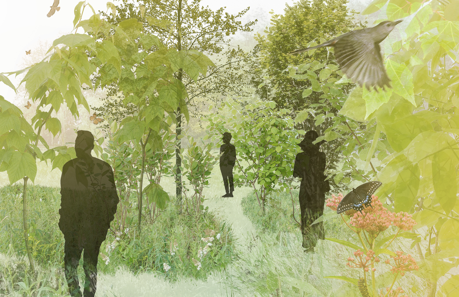 A collage highlighting the multi-species, immersive experience of small-town public park visitors spending time within the social spaces of a biodiverse ecological tree planting. Image credit: Matt Dallos