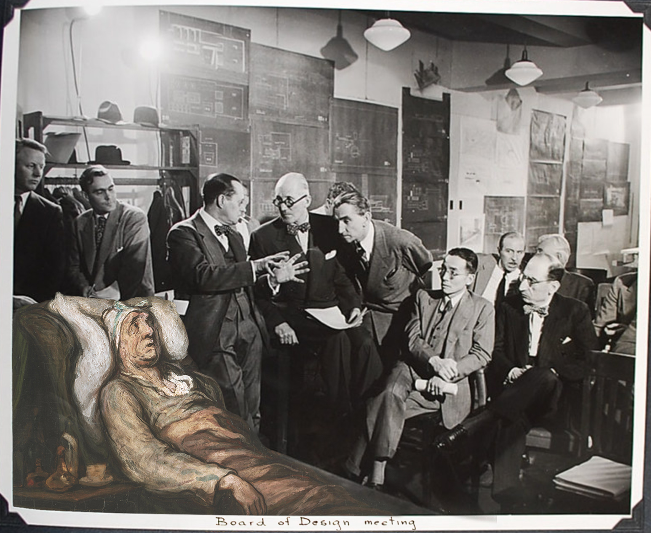 Collage depicting Argan, The Imaginary Invalid, being diagnosed by a team of architects. Image Credit: Chloe Munkenbeck; Source images from United Nations Archives, Le Corbusier, the Board of Design, and Wellcome Collection