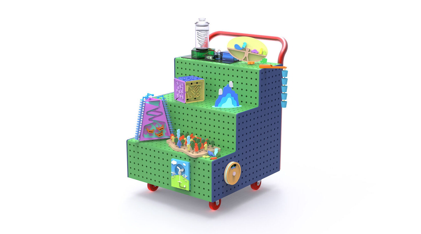Climate Stories mobile educational cart with toys including: wildfire, tornado, material cube, impact wheel, rain chain, compost, flow maze, and wind gush. Image credit: Yiyuan Li and Junming Pu