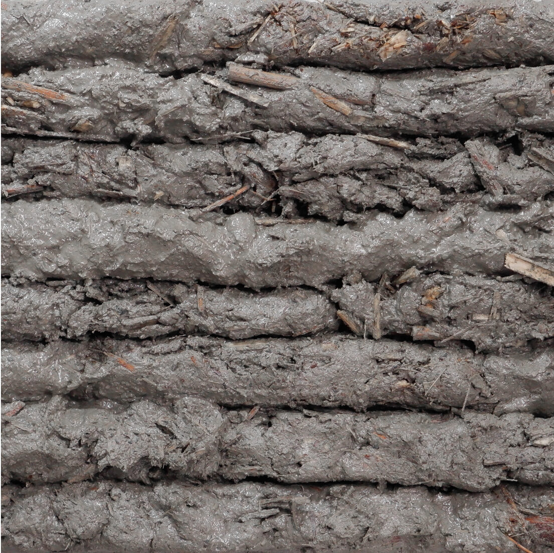 Construction-scale 3D printed clay mix based on traditional earth building materials: locally mined clay, sand aggregate, and fiber reinforcement processed from Phragmites and Japanese Knotweed. Image credit: Riley Studebaker