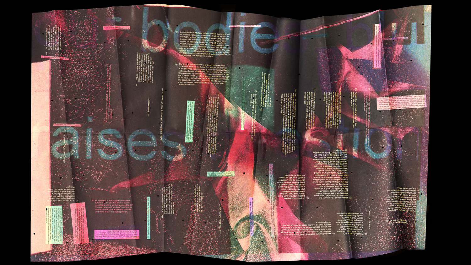 Exit Strategies: Rehearsing the Future Through Design is a publication documenting a six-month workshop that explores the intersection of choreography and graphic design. The project culminates in a designed pamphlet that will be shared at a public reading and performance on the theme of “Rehearsal” at Marsha P. Johnson State Park in Brooklyn, NY, in June 2026. It examines how design, viewed through queer temporality, can challenge linear narratives of progress by framing the present as a site of rehearsal for equitable futures.