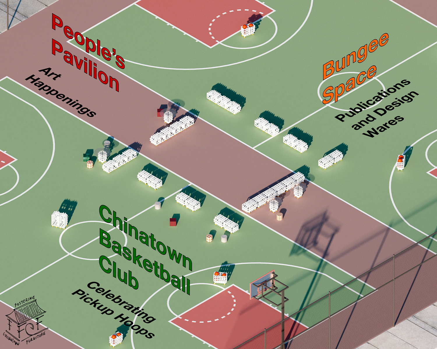 Adopt, Foster, Share is a community collaboration between partners People’s Pavilion, Bungee Space, and Chinatown Basketball Club to support temporary installation projects at Columbus Park, Chinatown. This project will develop a modular furniture system for public events, including festivals and sports tournaments, in Fall 2026. After de-installation, units will circulate via a foster program for use at home and on the street until the following year’s park events. Adopt, Foster, Share aims to sustain a culture of temporary installation design at Columbus Park while connecting neighbors through the shared stewardship of street furniture.