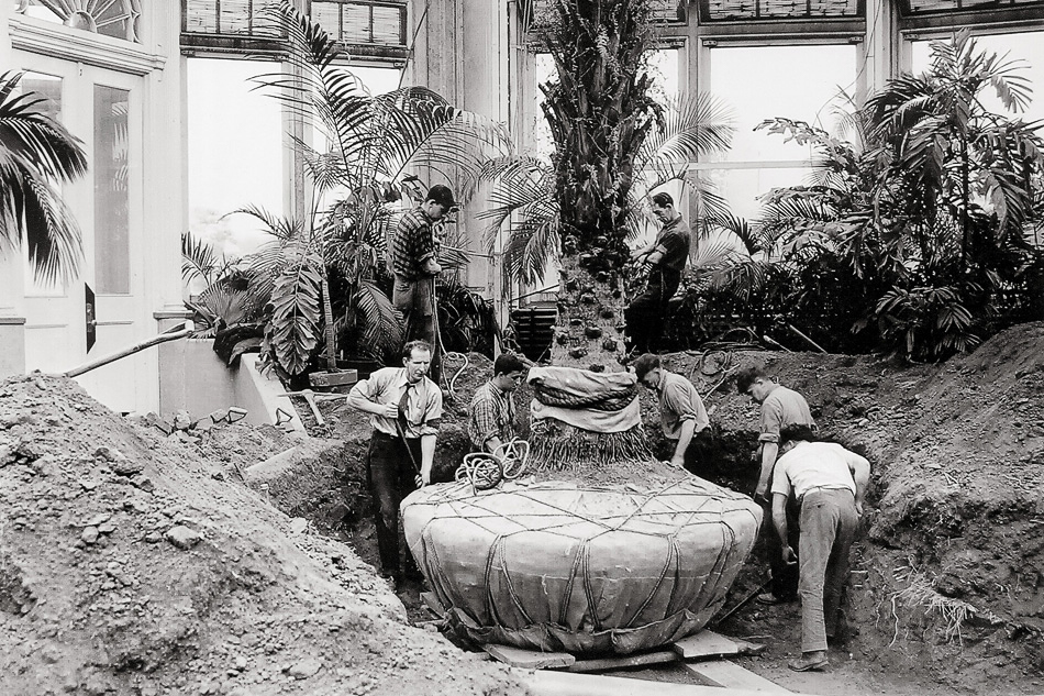 Arborists move a palm tree at the New York Botanical Garden, 1942. Image credit: New York Botanical Garden.