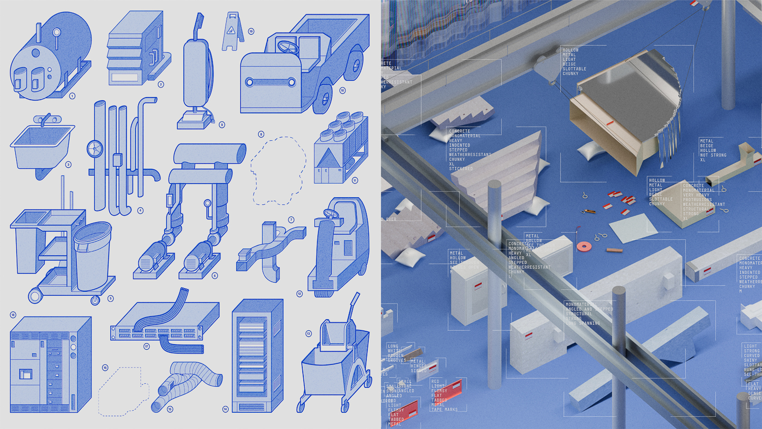 Left: Partial inventory poster, Office of Back of House. Image credit: Ekin Bilal; Right: Still from video game, The Objectiles Guide To Time Travel. Image credit: Celia Chaussabel