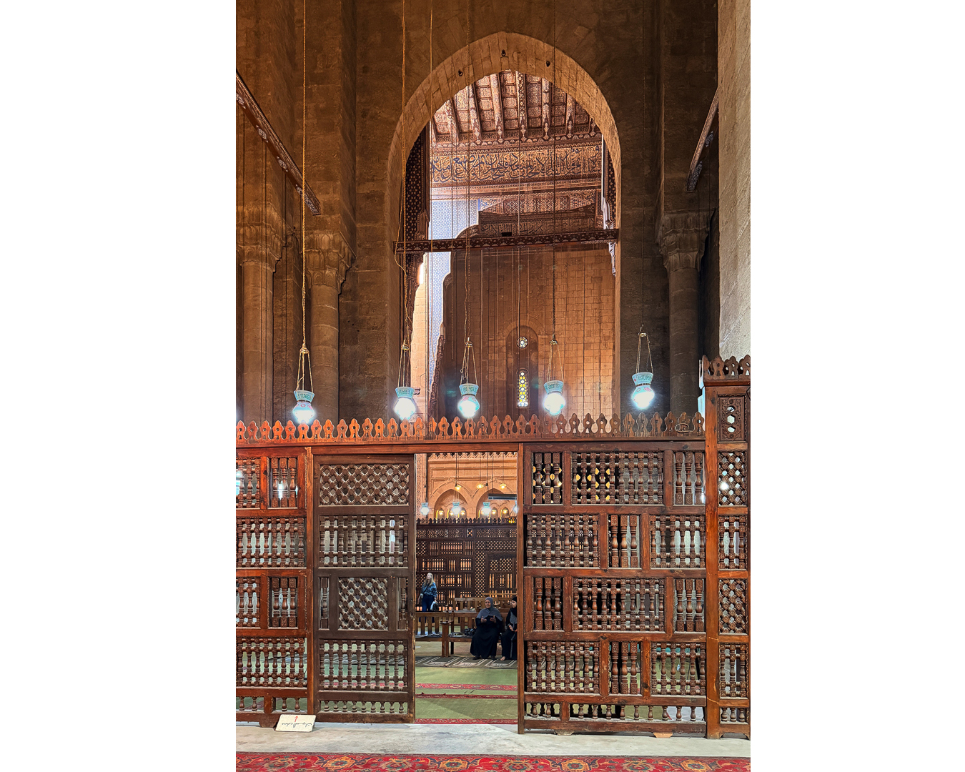 Women’s prayer space separated from the main hall by an ornate wooden mashrabiya screen inside a historic Cairo mosque. Image credit: Aya Abdallah