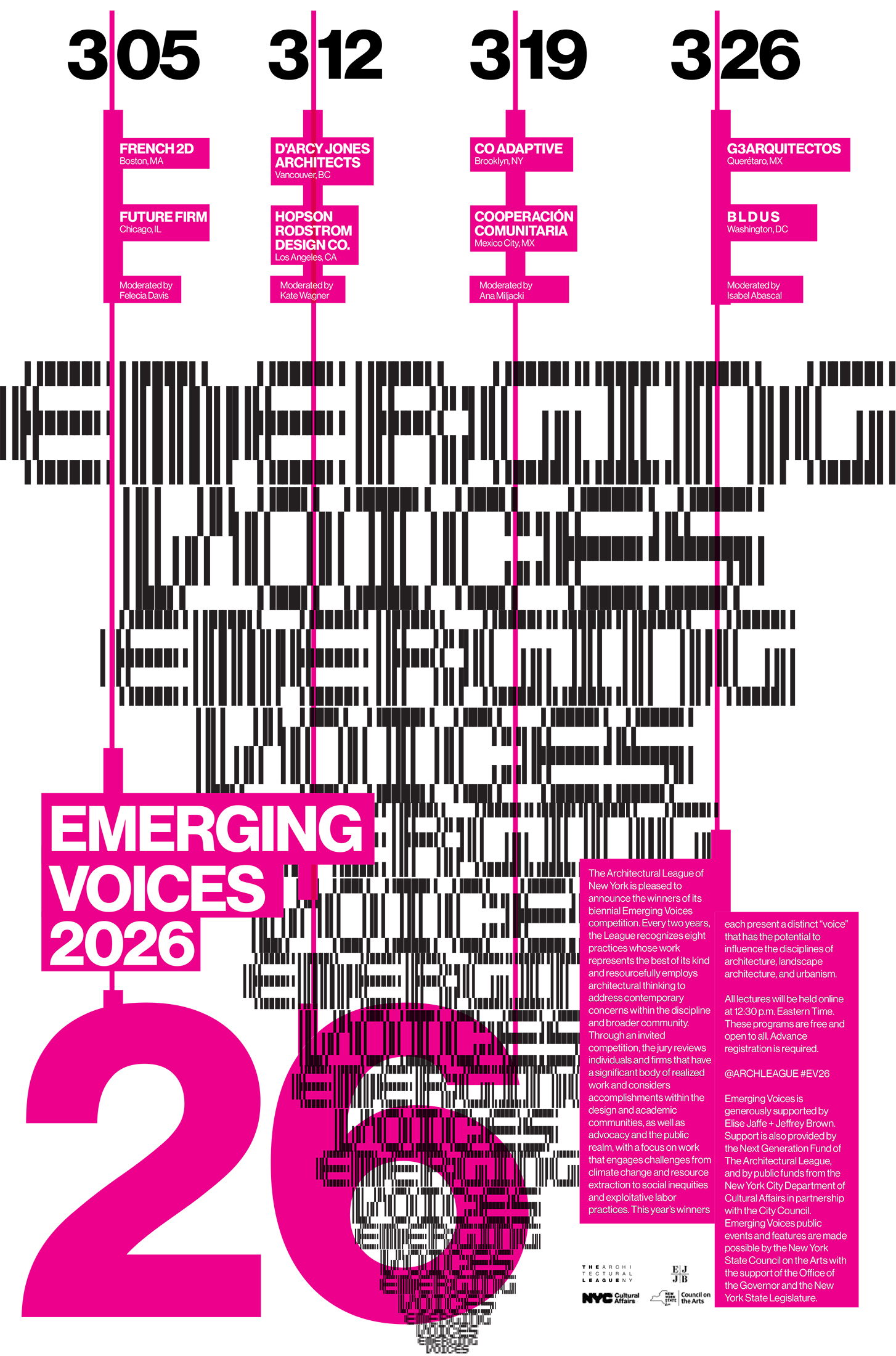 Emerging Voices is generously supported by Elise Jaffe + Jeffrey Brown. Support is also provided by the Next Generation Fund of The Architectural League, and by public funds from the New York City Department of Cultural Affairs in partnership with the City Council. Emerging Voices public events and features are made possible by the New York State Council on the Arts with the support of the Office of the Governor and the New York State Legislature.