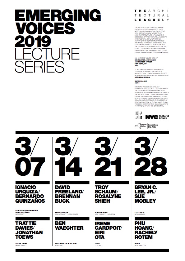 Emerging Voices is generously supported by Elise Jaffe + Jeffrey Brown. The Emerging Voices program is also supported by the Next Generation Fund of The Architectural League. Architectural League programs are additionally supported, in part, by public funds from the New York State Council on the Arts with the support of Governor Andrew M. Cuomo and the New York City Department of Cultural Affairs in partnership with the City Council.