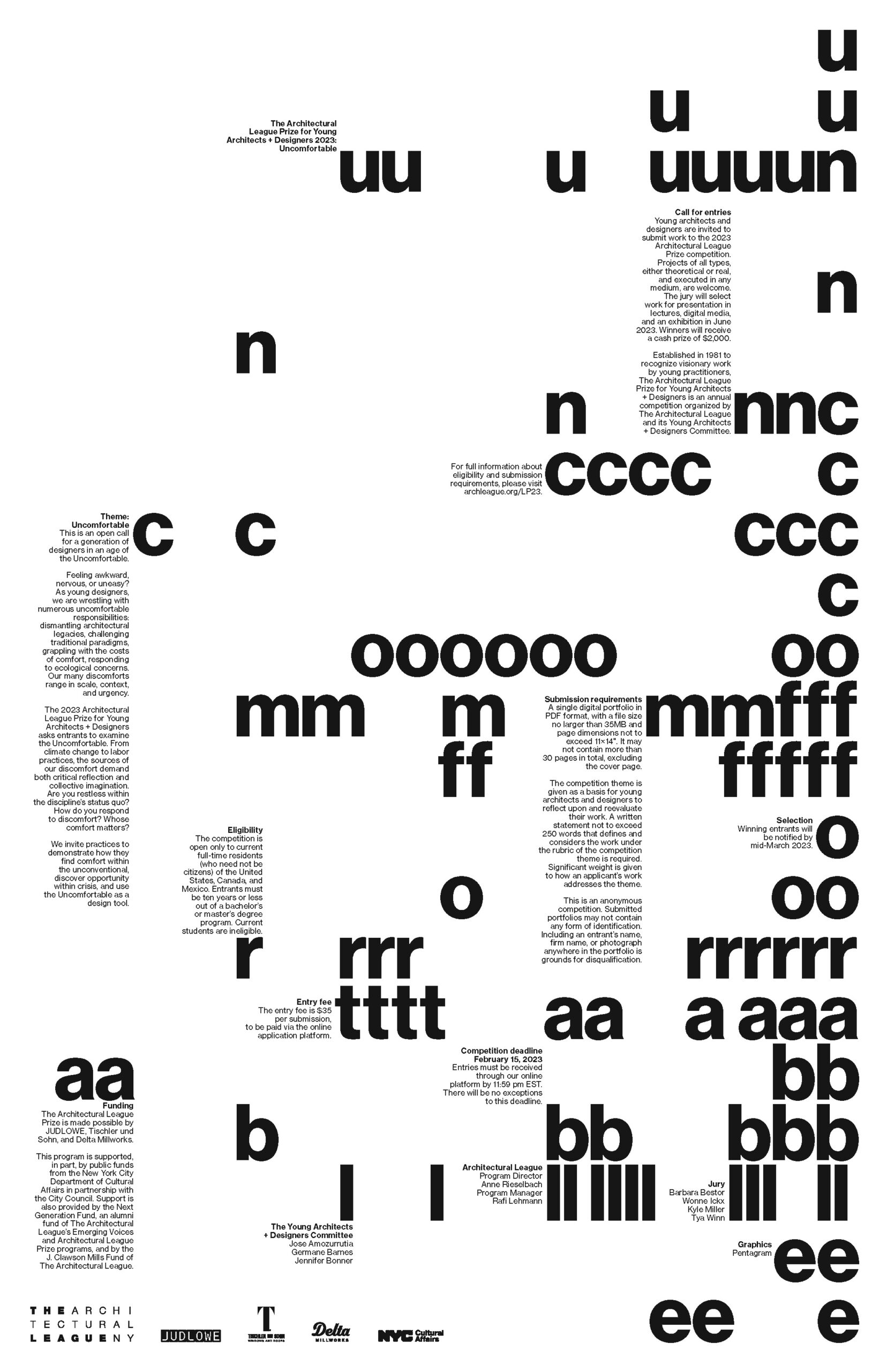 The 2023 Architectural League Prize for Young Architects + Designers asks entrants to examine the Uncomfortable. From climate change to labor practices, the sources of our discomfort demand both critical reflection and collective imagination. Are you restless within the discipline’s status quo? How do you respond to discomfort? Whose comfort matters?