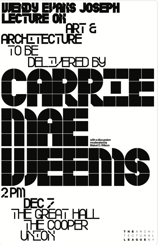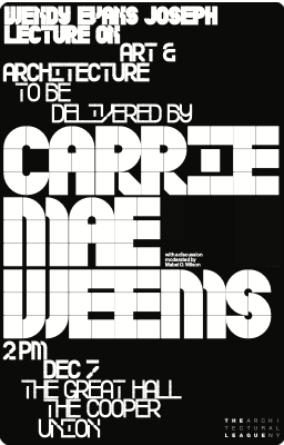 Carrie Mae Weems presents her work in a public lecture, followed by a conversation with Mabel O. Wilson. The event includes an audience question-and-answer session.