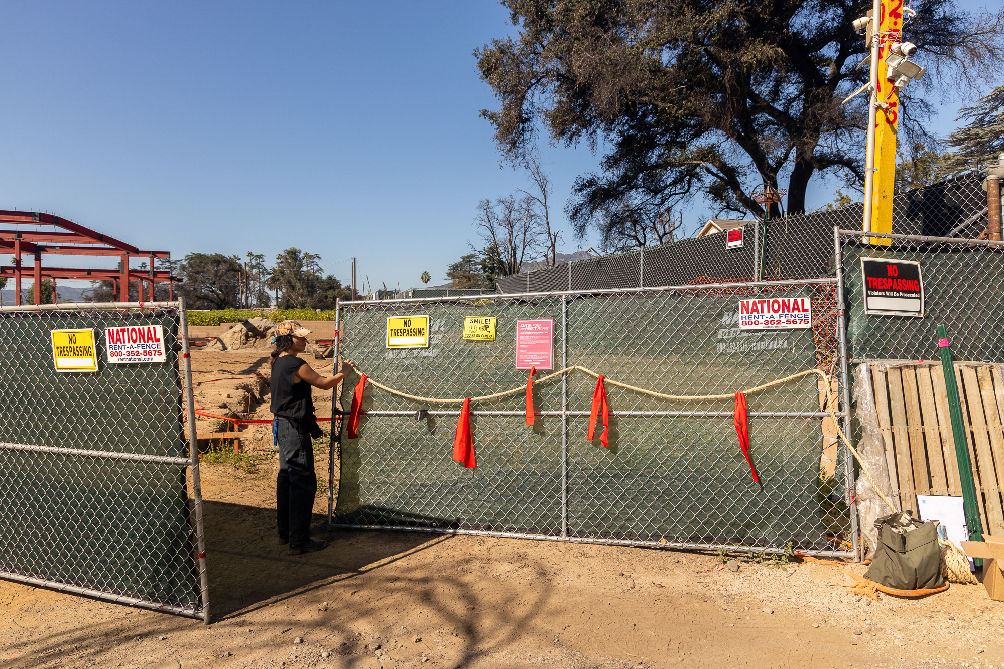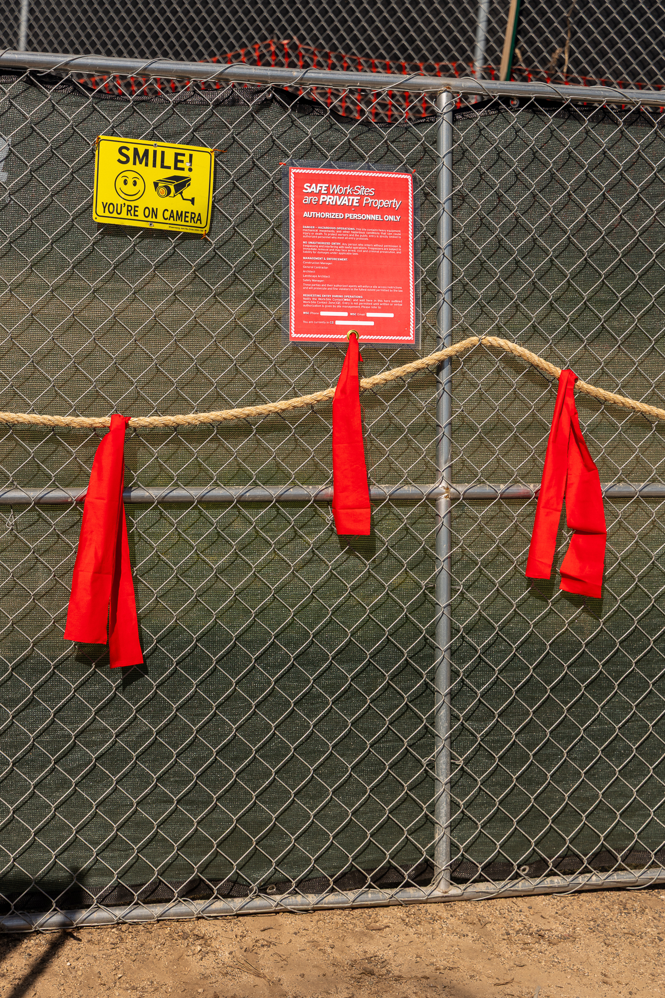 The Red Line, the winning Sign and Line proposal by Eric Arneson and Nahal Sohbati of Topophyla and Gabriel Castro-Andrade, is a site access strategy that uses clear boundaries, scalable protocols, and specific points of contact to manage entry into active jobsites. Inspired by global traditions of cloth as a signifier of protection, solidarity, and unity, the system specifies commonly available materials to establish a continuous perimeter line marked with red fabric, designated contact zones, standardized signage, and a single point of authority.